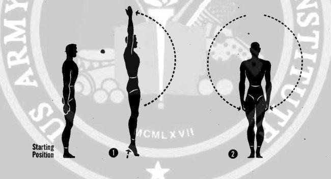 De pé, com o torso erguido, deve fazer girar seus braços para a frente acima de seus ombros, de modo que os bíceps passem pelo lado das orelhas. Ao mesmo tempo que faz isto deve tirar os calcanhares do chão, aguentando seu peso com a ponta dos pés.