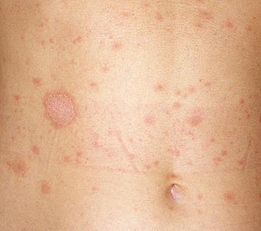 A morfologia das lesões é muito característica e consiste em maculopápulas arredondadas ou ovais, com seu eixo maior paralelo às linhas da pele, de cor rosada e coberta com escamas finas e secas.